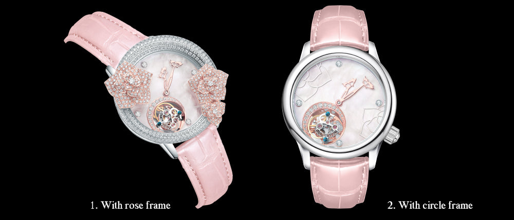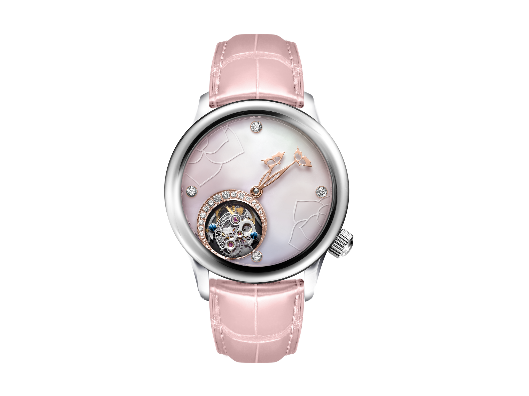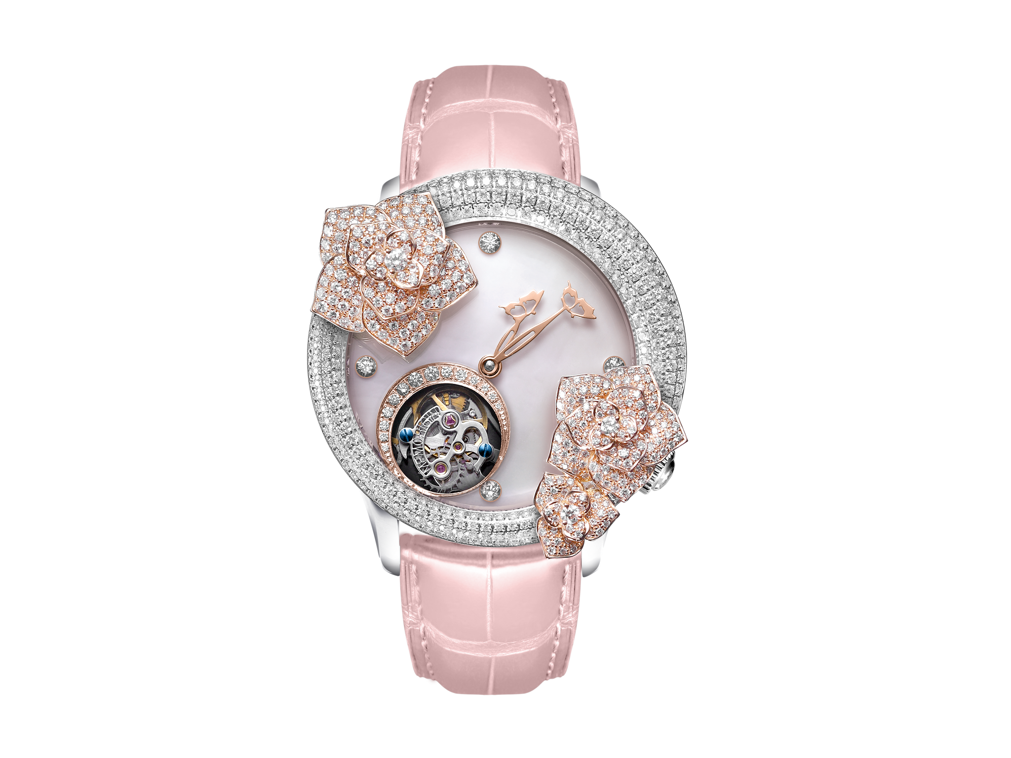 The Butterfly Rose Tourbillon Watch portrays a charming modern woman who is as beautiful as a rose. She also possesses the fascinating characteristics of a butterfly: pretty-to-see and hard-to-catch.