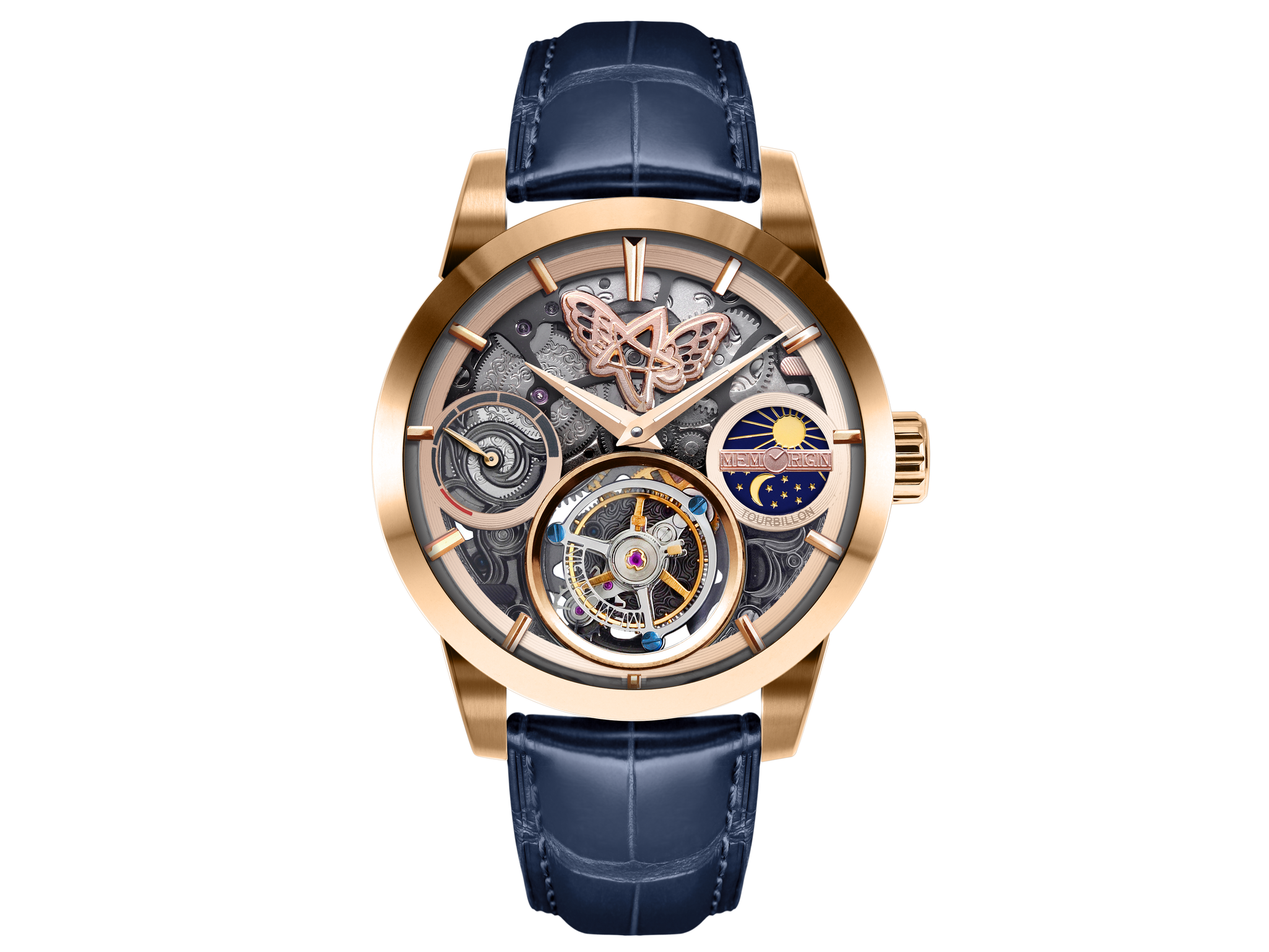 The Clara Series particularly used the rose gold color as its theme because Clara thinks rose gold presenting the elegance and easy to match with different styles. Besides, the engineer selected the 80-hour-tourbillon movement in frequency of 28,800 oscillations / hour for this series. In additions, the design has added some feminine elements which specially chosen a red alligator strap to match with tourbillon watch. For another blue alligator strap will be the second options, which represents the independence and prestige status.