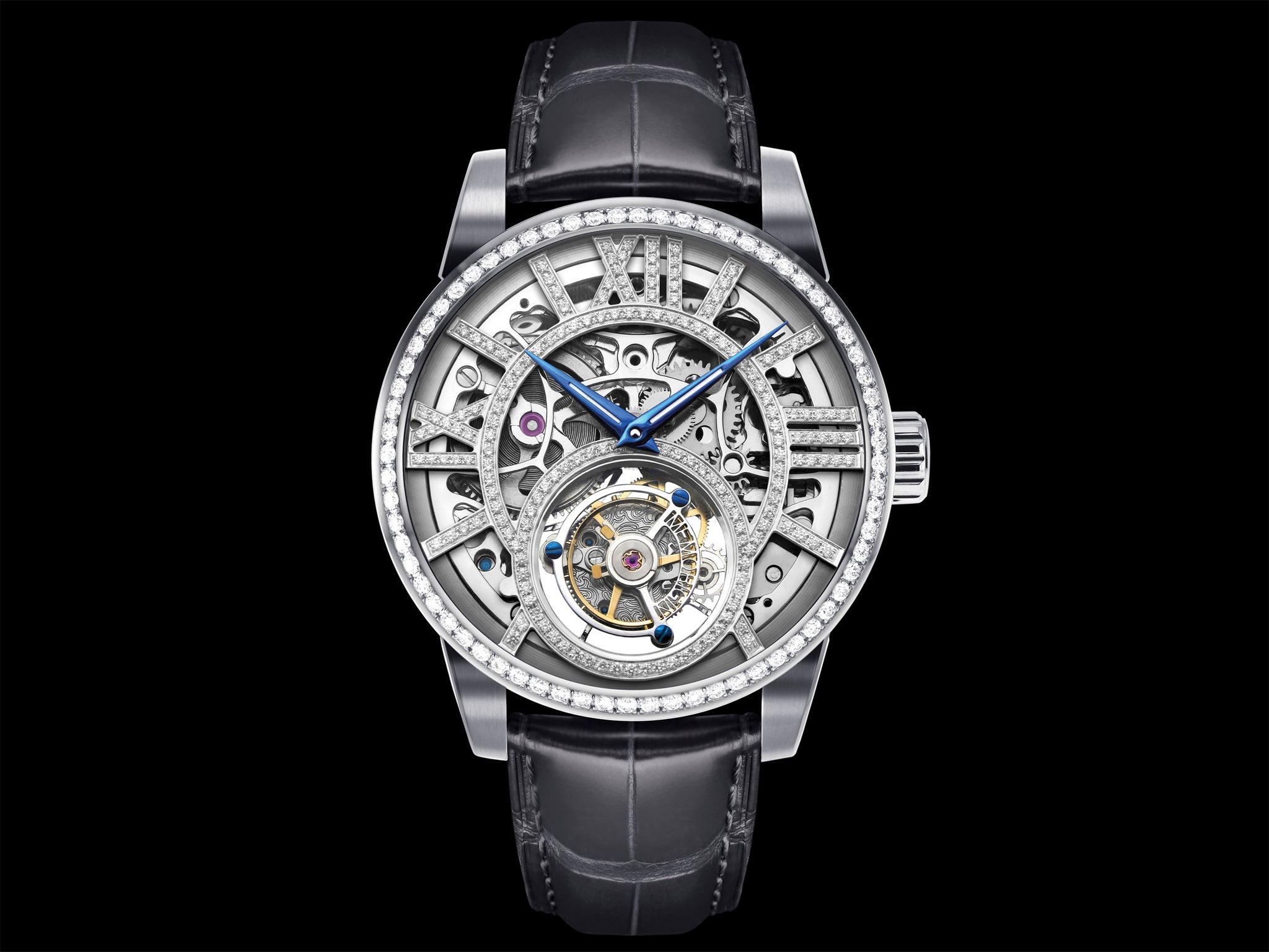 The dial is fully skeletonized. A total of 251 diamonds weighing 1.37 carats are embedded on the Roman numeral indices and the stainless-steel watch case. The tourbillon movement glitters with the lustrous dial design, fulfilling the craftsmanship and aesthetics that the gentlemen are asking for.