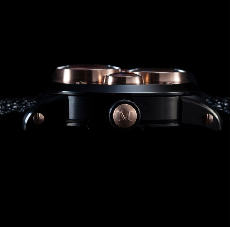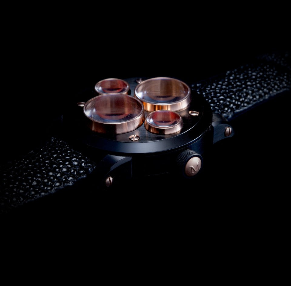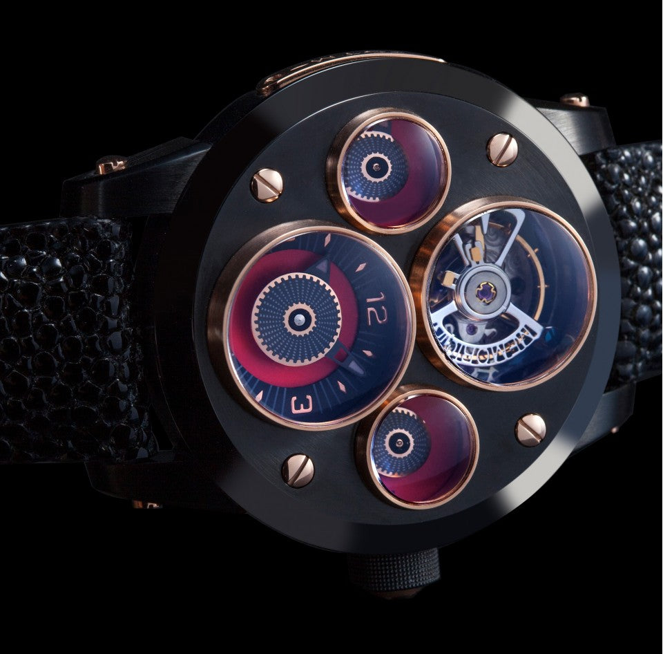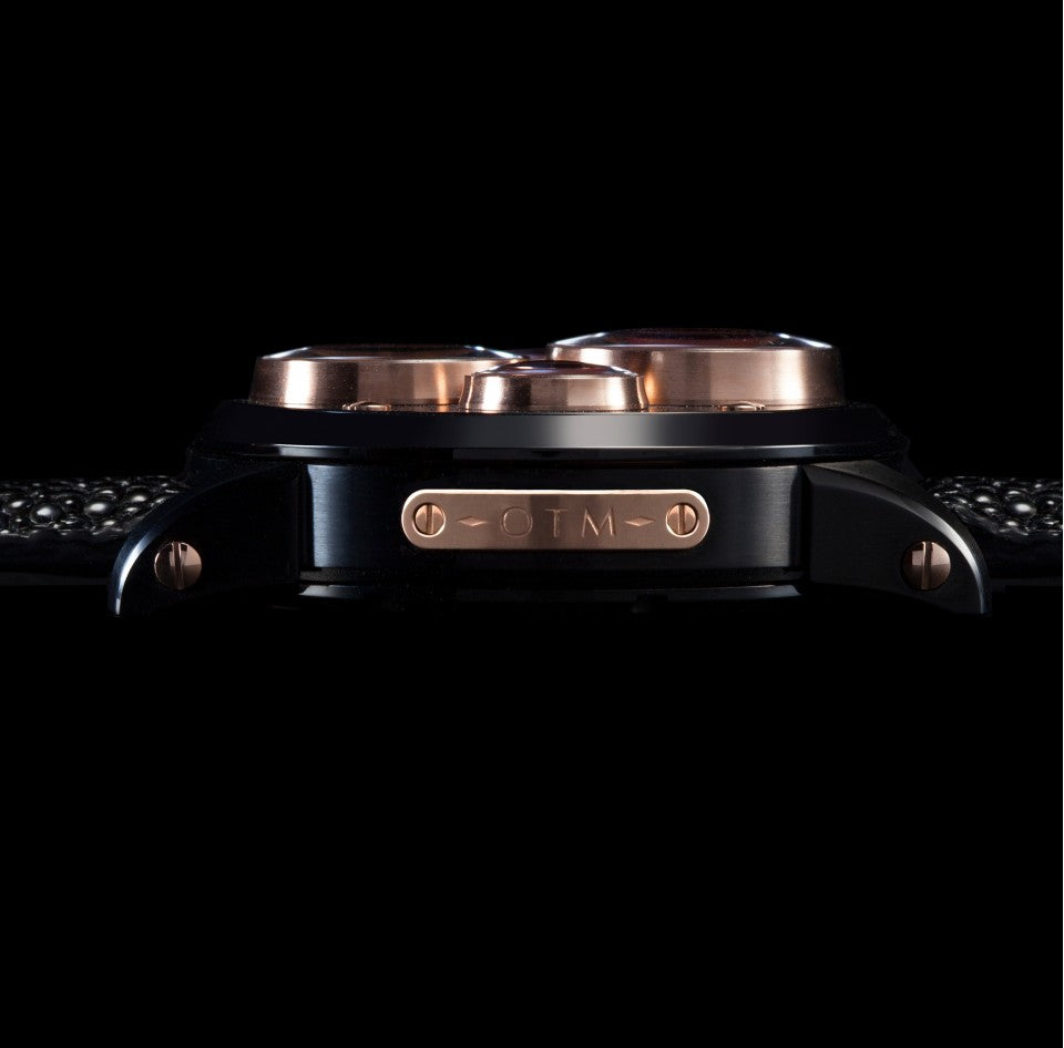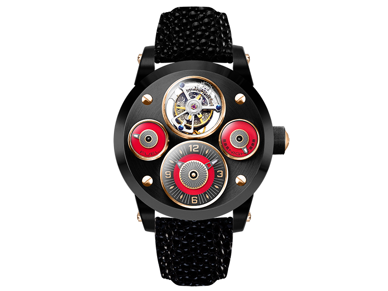 The Hong Kong famous music producer and designer Mark Lui created this watch with the concept of "time factory". The dial has four pillar-like windows, retaining the classic "chimney" styling of "The Time Machine". Mark's initial "M" is carved on the crown. It comes with a PVD-black stainless-steel case and a black stingray strap.