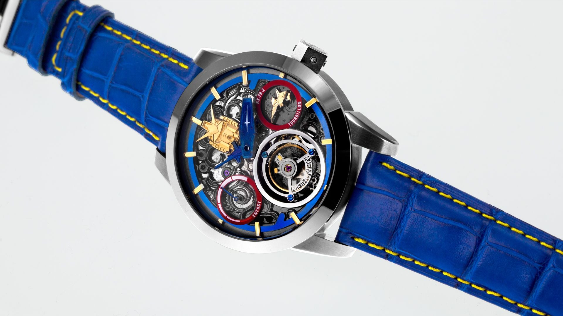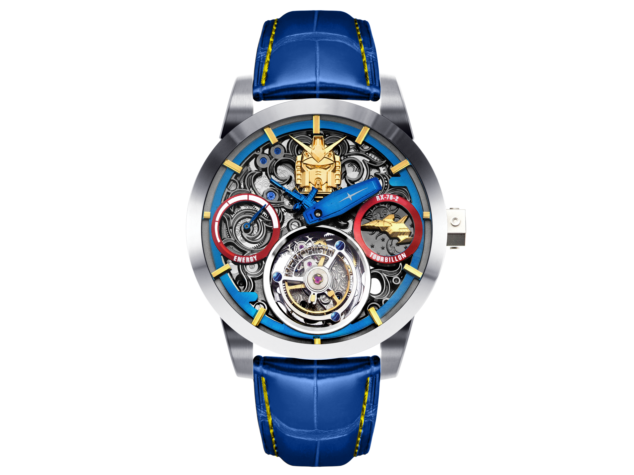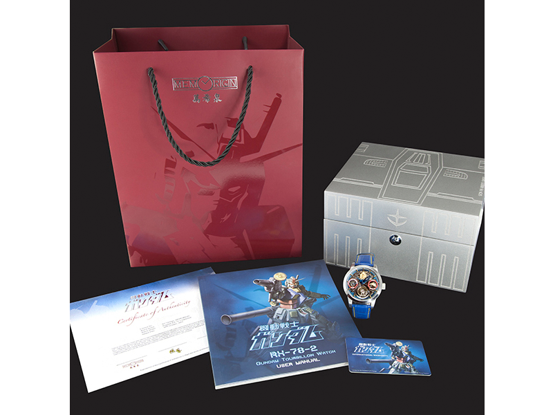 Art Vantage Trading Limited, Memorign Taiwan distribution branch, cooperated with Bandai to design the first Gundam tourbillon watch. Using the red, yellow, blue, and white as the main colors, it can be recognized as Gundam at a first glance. The RX-78-2 Gundam was used as the theme of watch. The top metal Gundam's head engraving is placed at 12 o'clock. The spaceship sculpture and power reserve indicator occupied 3 o'clock and 9 o'clock position respectively. The exclusive styling gun and shield of Gundam are the pointers. All these elements enhanced the image of Gundam in this series. Coupling with special color straps and the design of its spacecraft as the watch box changes the mature image of tourbillon.